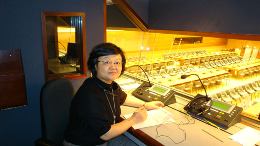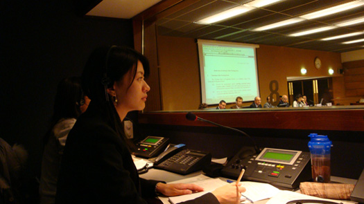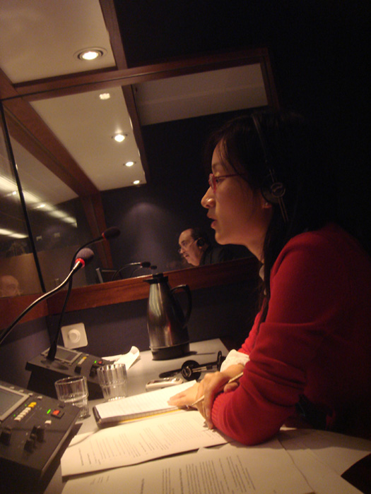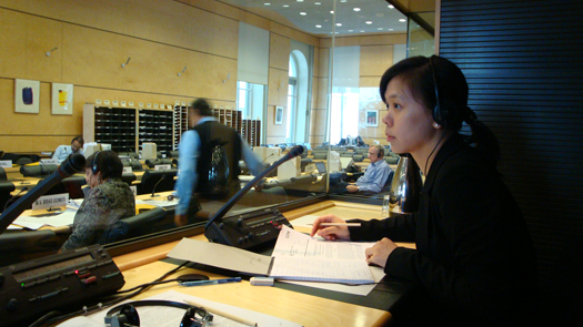 张爱玲老师在万国宫26号会议厅中文厢做会议前准备;会场另一端右边即为学生的练习厢