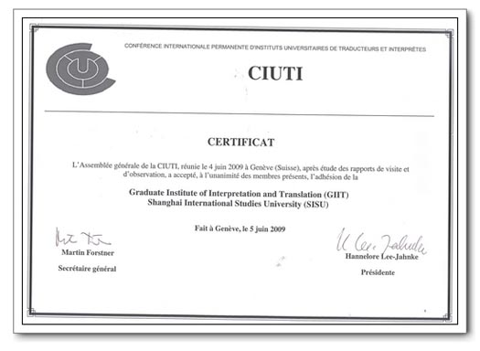 2009年12月21日,国际高校翻译学院联合会会长莉阳凯教授、国际高校联合会秘书长佛斯纳教授来到上外高翻学院,正式将国际高校联合会会员证书授予高翻学院。授牌仪式由高翻副院长戴惠萍教授主持,国际高校联合会会长莉阳凯教授致辞,她首先祝贺高翻通过不懈的努力成功加入国际高校联合会,这是国际最高水准高翻学院的殿堂,并希望在更多项目方面与上外高翻继续合作。院长柴明颎教授代表高翻接受了国际高校翻译学院联合会会员证书并作简短致辞,表示学院将继续努力以国际一流翻译学院水准为目标,发展和完善学院的专业翻译教学和研究工作,并拓展与其他联合会成员的合作与交流。