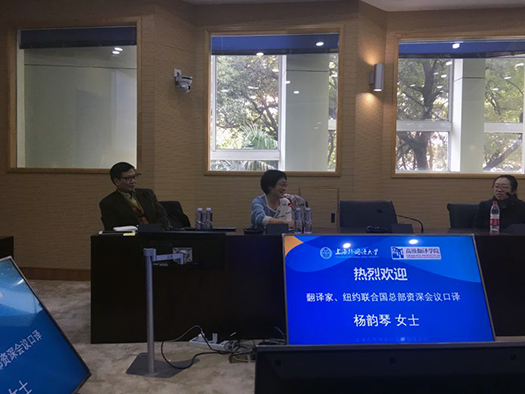 2016年11月29日上午,翻译家、纽约联合国总部资深会议口译杨韵琴老师应邀访问上外高翻并在二楼同传会议室为师生做了题为“漫谈联合国口译”的精彩讲座。会议口译专业全体学生、翻译硕士二年级学生及部分高翻教师参与讲座。讲座由高级翻译学院副院长戴惠萍教授主持。