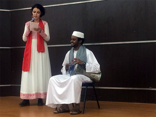 节目一开始,来自埃及的艾雪儿用一口纯正近乎播音员的阿拉伯语标准语吸引了观众们的注意力,苏丹的周瑜和摩洛哥的依云为大家献上了诗歌朗诵《无为》,阿拉伯国家传统乐器与节奏明快的朗诵配合,新颖的表现方式让人耳目一新;苏丹的张芳芳则带来了声情并茂的诗歌朗诵《咖啡览人生》,轻松的诗句蕴含的人生哲理引人回味;埃及的金丝兰献唱歌曲《爱的光芒》,动情的演唱引得台下的观众频频鼓掌;来自阿盟的多位同学为大家带来了精彩的舞台剧表演《伊本·白图泰归来》,节目大胆想象,展现了摩洛哥古代著名大旅行家伊本·白图泰在当今阿拉伯国家的见闻,将阿拉伯国家之前的繁荣与现在充满战争困境的现实形成对比,反转强烈,最后用战争中诞生的婴儿喻指阿盟成立所带来的新希望,幽默的形式结合感人的情节,使大家在享受舞台剧的同时了解体会阿拉伯国家现状,发人深思。