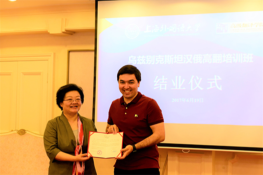 学员代表、乌兹别克斯坦国立东方大学国际政治和历史哲学学院院长、乌中友好协会副主席毕国毅对于上外在此次培训班期间所做的工作表示由衷的感谢,表扬了高翻学院俄语口译班同学们认真刻苦的学习精神,介绍了国立东方大学的“汉语热”,表示了与上外今后在各方面继续合作的意愿,还邀请上外代表团参加今年11月即将在乌兹别克斯坦举办的大型国际学术研讨会议。高翻学院院长张爱玲做了总结发言并为学员颁发结业证书。