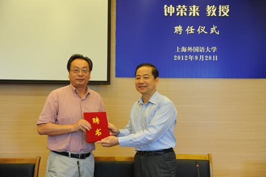 9月29日上午,在高翻学院模拟会议室举行了钟荣来兼职教授的聘任仪式。曹德明校长、中国驻欧盟使团公使衔参赞钟荣来先生以及高翻学院院长柴明颎教授出席了此次聘任仪式。