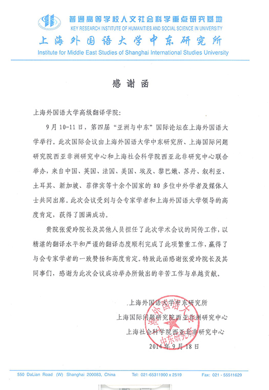 2014年9月10-11日,我院张爱玲、杨安其、王吟颖三位口译老师为第四届“亚洲与中东”国际论坛提供会议同传服务。以下为会议主办方的感谢信: