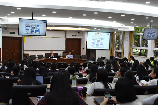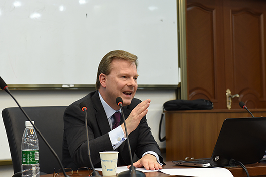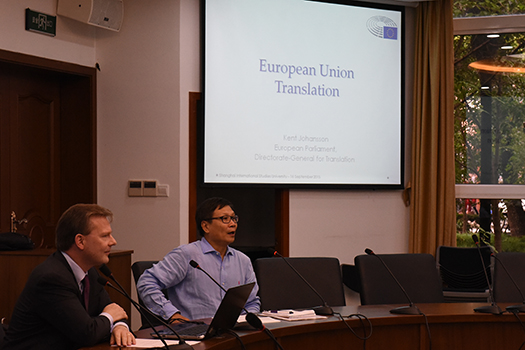 Kent Johansson先生首先介绍了欧盟的官方语言的情况,欧盟现在28个成员国,24种官方语言。所有官方文件,包括以往通过的条约和协议,都必须有24种语言译本。接着,Kent Johansson先生讲到了译者的职业操守问题,他特别指出在欧盟做文件翻译,不仅要对客户高度负责,仔细推敲译文,而且要有明晰的时间观念,一定要在deadline之前交出译文。随后,Kent Johansson先生介绍了欧盟内部所使用的翻译技术工具,一套专属的EURAMIS系统和一份不断完善的术语表。,他认为,在利用翻译语料库的基础上,机器翻译可有效提高翻译速度。最后,Kent Johansson先生鼓励同学们要大胆接触不同的人,要锻炼自己快速学习的能力。